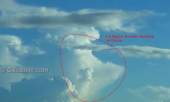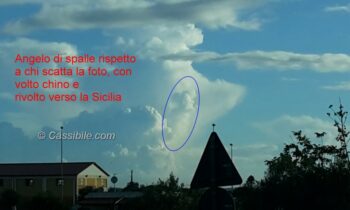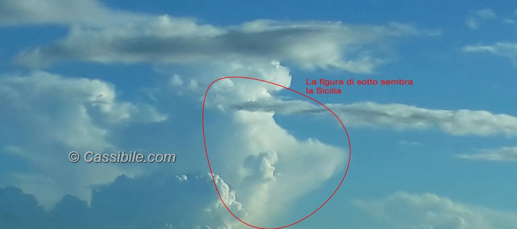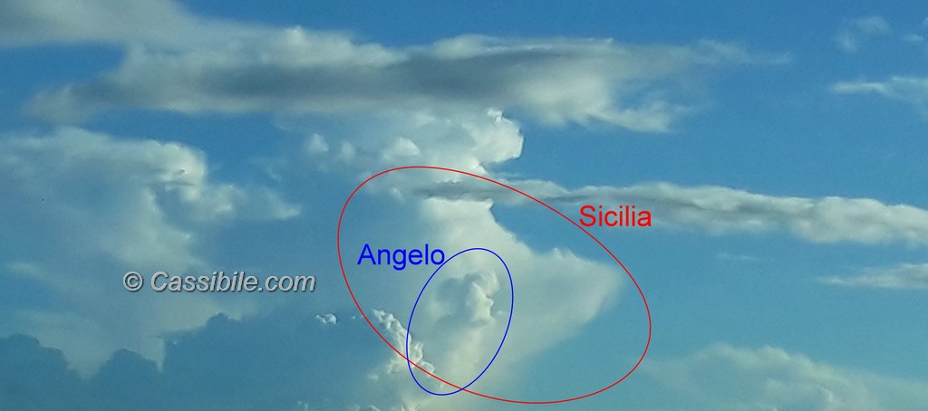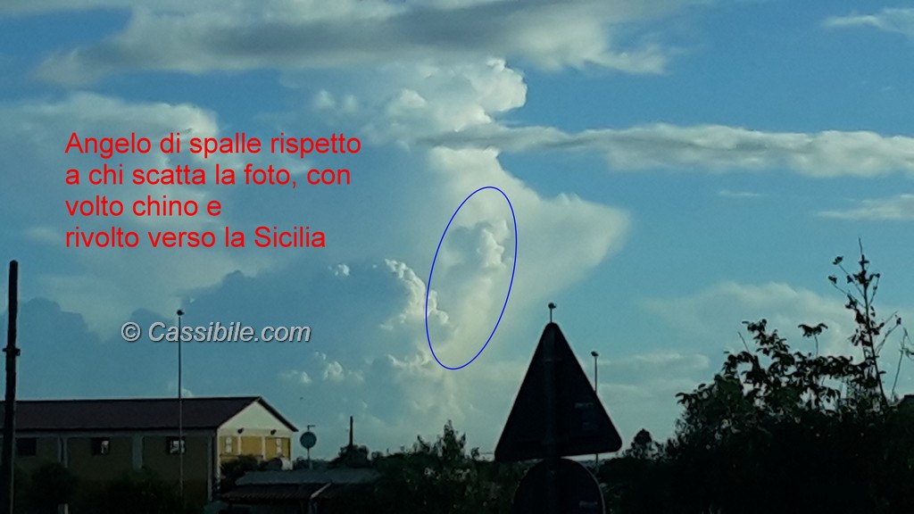 Che le nuvole assumano strane forme questo si sapeva già. E’, infatti, abitudine dei bambini giocarci e dare la forma di un cuore, di un animale, di un gatto, di un cane o altre più strane. La figura, anzi le figure, che abbiamo visto stamani (12 agosto 2015) nel cielo di Cassibile avevano delle sembianze che meritano di essere raccontate. Chi è passato sulla statale 115 Cassibile-Siracusa poco dopo le 7,30 l’avrà potuto notare. E’ durato pochi istanti. Le immagini ci raccontato di un Angelo voltato che guarda la Sicilia. Le figure in questione, appunto, sono due, l’Angelo e la Sicilia.