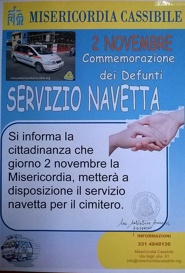 La Misericordia di Cassibile, in occasione della commemorazione dei defunti, il 2 Novembre mette a disposizione di tutti i cassibilesi il servizio navetta per il cimitero. Partenza da Cassibile e arrivo al cimitero di Siracusa e viceversa. Chi è interessato può contattare il numero della Misericordia 3314848136