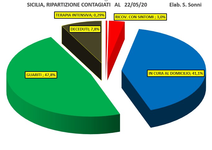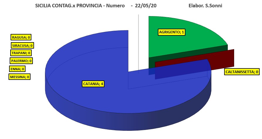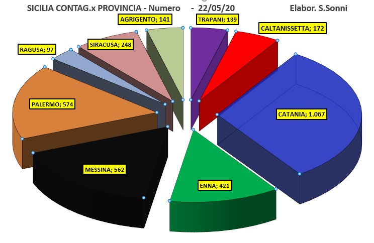 Ancora 4 nuovi casi il 22 maggio in Sicilia, tutti e solo a Catania. Contagiati totali sono così 3.421, di cui 10 in terapia intensiva, 103 ricoverati in ospedale, 1.404 in cura ai domicili, 1634 guariti e 268 deceduti. Oggi 7 guariti e nessun deceduto.