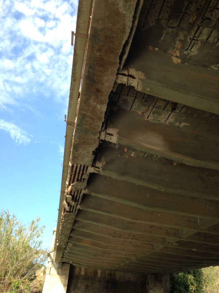 Le foto parlano da sole! Qui bisogna muoversi subito prima che ci scappi il morto o i morti. La situazione non è una delle migliori e a vedersi sembrerebbe che stia per crollare, o forse no? Come vedete è il famoso, ormai “vecchiotto”, ponte sul Fiume di Cassibile, che collega il territorio cassibilese ad Avola. Il ponte, costruito parecchi anni fa, è lì in silenzio che sussurra “aiuto, fate qualcosa!”
