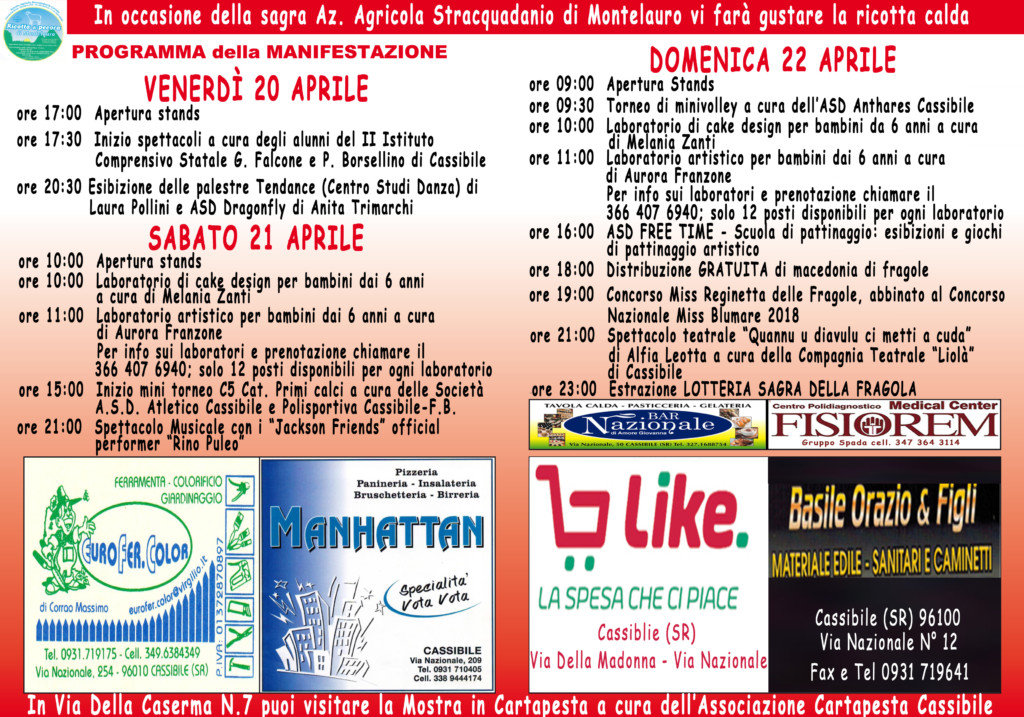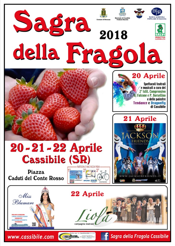 CASSIBILE – Ritorna a Cassibile il tanto atteso appuntamento annuale. E’ la Sagra della Fragola che quest’anno si svolgerà dal 20 al 22 aprile 2018. La location è sempre la Piazza Caduti del Conte Rosso.