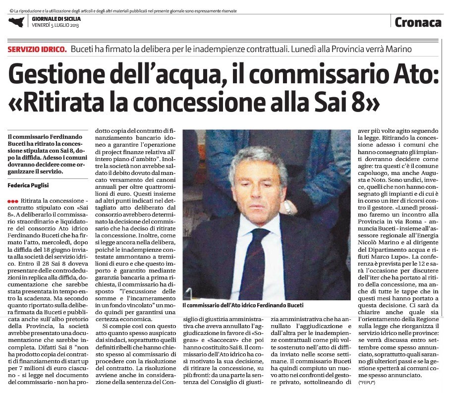 (cassibile.com) SIRACUSA – Con riferimento all’articolo pubblicato sul ” Giornale di Sicilia” in data 05/07/2013 per mezzo del quale e’stata diffusa la notizia che il Consorzio Ato di Siracusa avrebbe provveduto a revocare a SAI8 S.p.A. la concessione di gestione del Servizio Idrico Integrato, l’Ing. Angelo Isoppo, Presidente di SAI8, ritiene necessario precisare quanto segue, al fine prioritario di rassicurare l’utenza, interessata alla continuità ed al buon funzionamento del servizio.