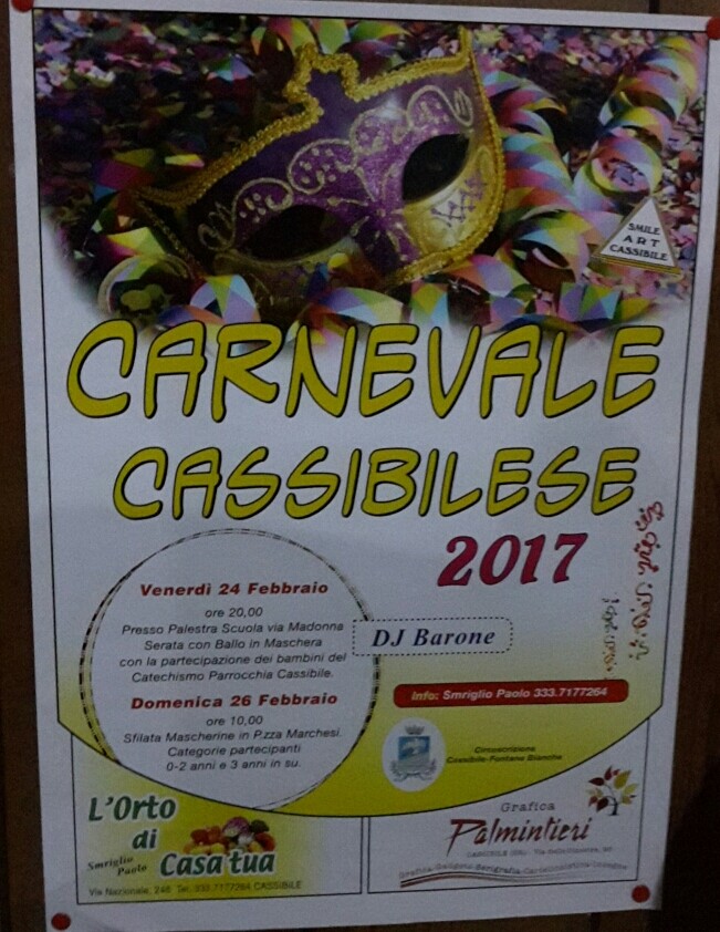 E’ tempo di Carnevale a Cassibile, due giorni di festa indimenticabili CASSIBILE – La festa più folle dell’anno a Cassibile comincia il venerdì, giorno 24 febbraio 2017. Grazie all’instancabile Paolo Smriglio dell’Associazione Smile Art di Cassibile, con l’aiuto dei suoi fedelissimi di sempre e di sponsor privati, a Cassibile si fa festa. I fondi a disposizione sono pochi e armati di buona volontà, gli organizzatori, fanno quel che possono fare, pur di animare il “Paesello”. Saranno due giorni di festa in cui grandi e piccini potranno darsi alla pazza gioia, tanto per cambiare la normale routine quotidiana. Il carnevale a Cassibile è patrocinato dalla Circoscrizione Cassibile-Fontane Bianche.