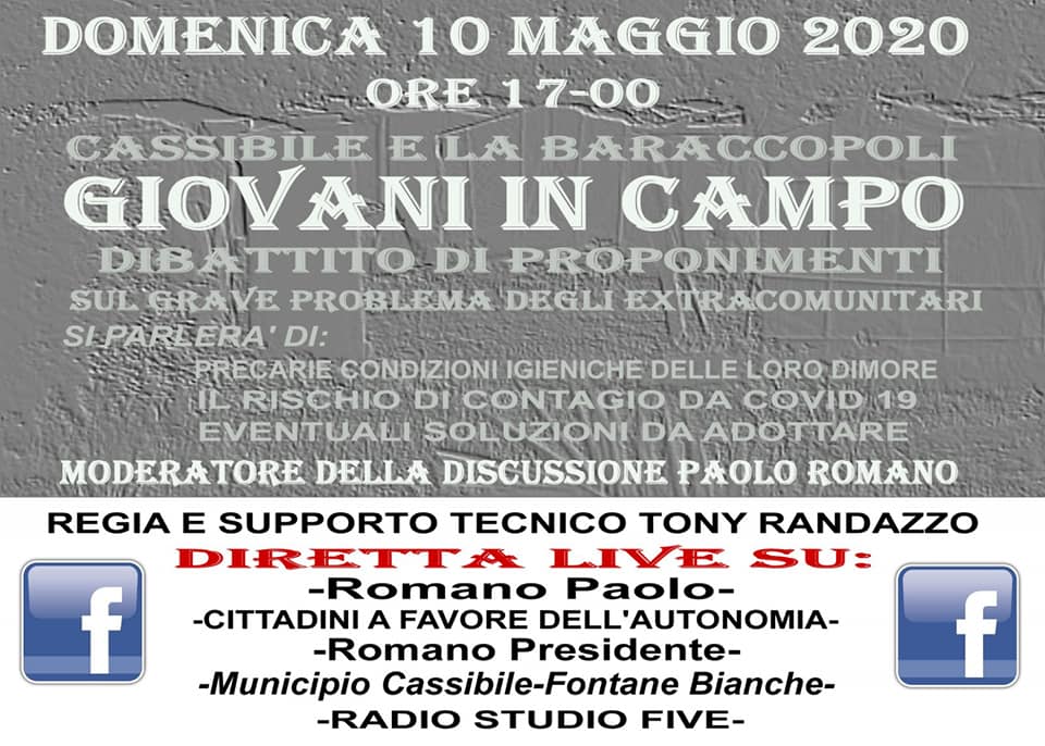 Un dibattito ci sarà, sempre nel pomeriggio alle ore 17, in diretta Facebook sul grave problema degli extracomunitari e l’utilizzo della baraccopoli. La diretta sarà sulle pagine Romano Paolo, Cittadini a favore dell’autonomia, Romano Presidente, Municipio Casisbile-Fontane Bianche, Radio Studio Five con la regia e il supporto di Tony Randazzo. Si parlerà di precarie condizioni igieniche delle loro dimore, il rischio di contagio da covid 19, eventuali soluzioni da adottare. La diretta sarà condivisa anche nelle pagine di cassibile.com